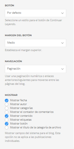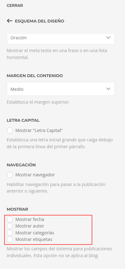 Además, para que no se muestre esta información en la visualización de noticias en formato bloga (al acceder a una categoría) tenemos configurar la sección Blog que está en YooTheme | Esquema de Diseño | Blogs
