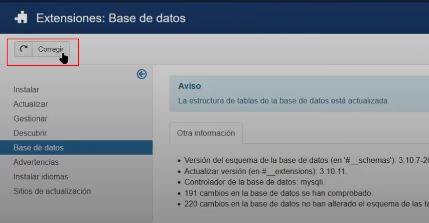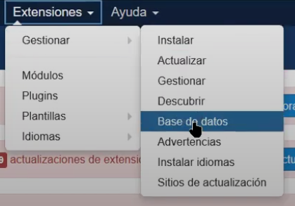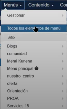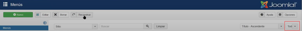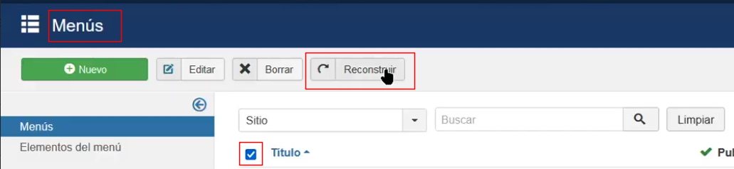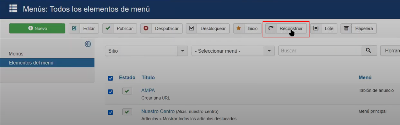 Menús, Gestionar. Seleccionamos que se muestren todos. Seleccionamos o marcamos todos. Ejecutamos Reconstruir.