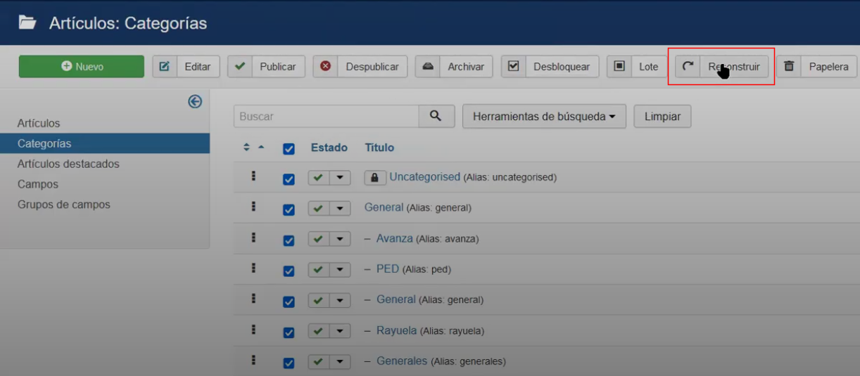 Contenido. Categorías. Seleccionamos que se muestren todas las categorías. Seleccionamos o marcamos todos. Ejecutamos Reconstruir.
