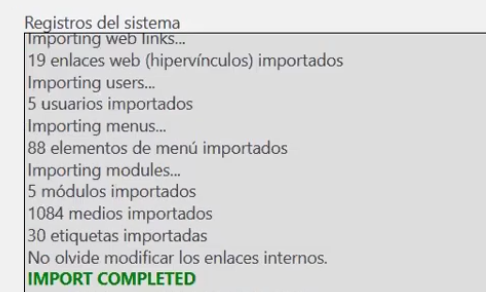 Miramos y esperamos. El tiempo de espera dependerá de la cantidad de información que se tenga que pasar de un portal al otro. Es posible que se muestren mensajes de error durante el proceso, es normal que algún elemento no se pueda migrar bien. Cuando termine, nos mostrará un mensaje de Import Completed en la ventana de log o registro del sistema